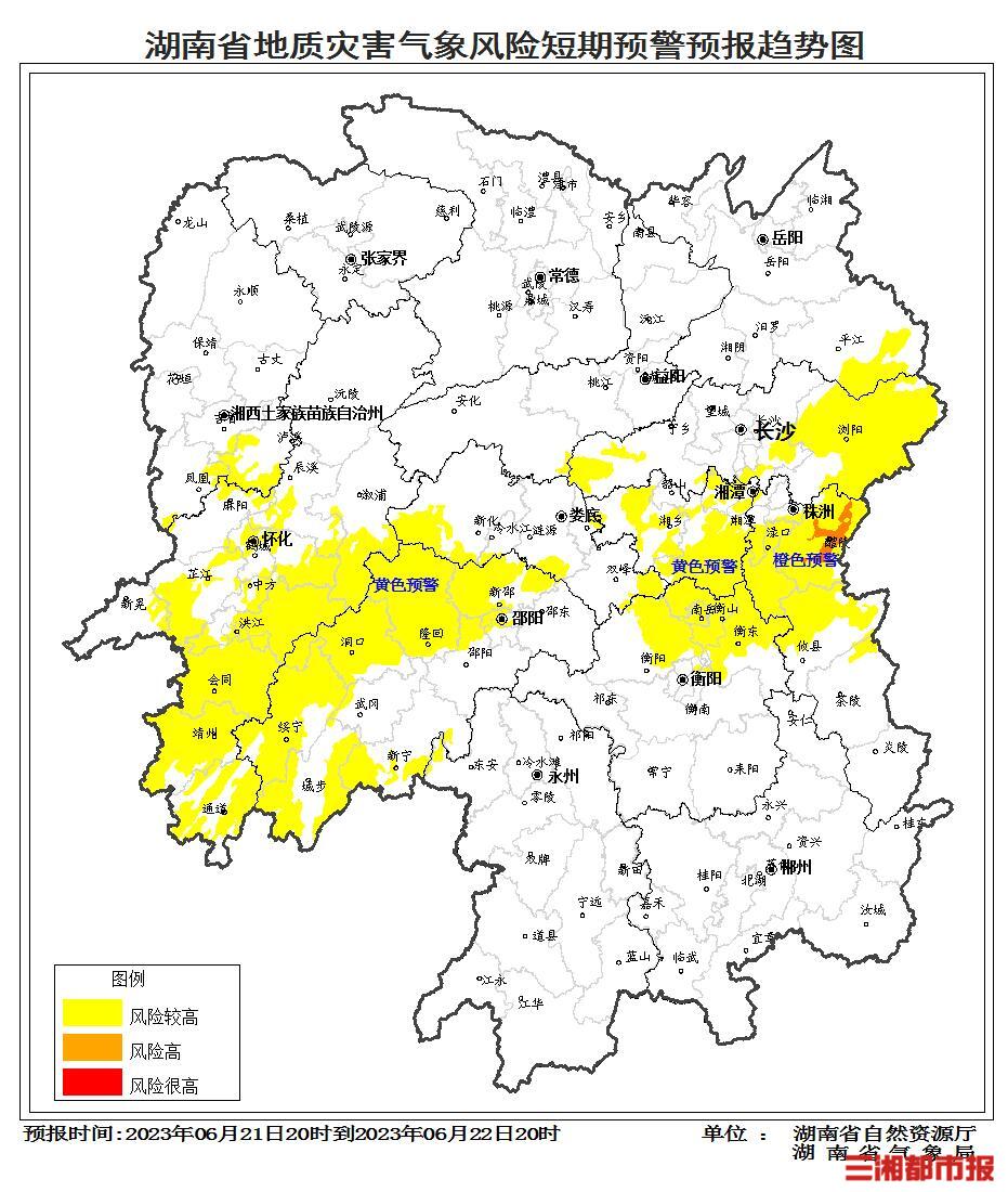 三湘都市报·新湖南客户端6月21日讯(文/视频 全媒体记者 李致远 通讯员 林城)根据地质灾害成灾规律和孕灾条件,结合2023年6月21日短期气象预报情况,省自然资源厅与省气象局联合会商得出如下结论:自6月21日20:00至22日20:00,受降雨影响, 湘东局部区域发生突发性地质灾害风险高(橙色预警),湘东、湘中、湘西南大部分区域发生突发性地质灾害风险较高(黄色预警)。