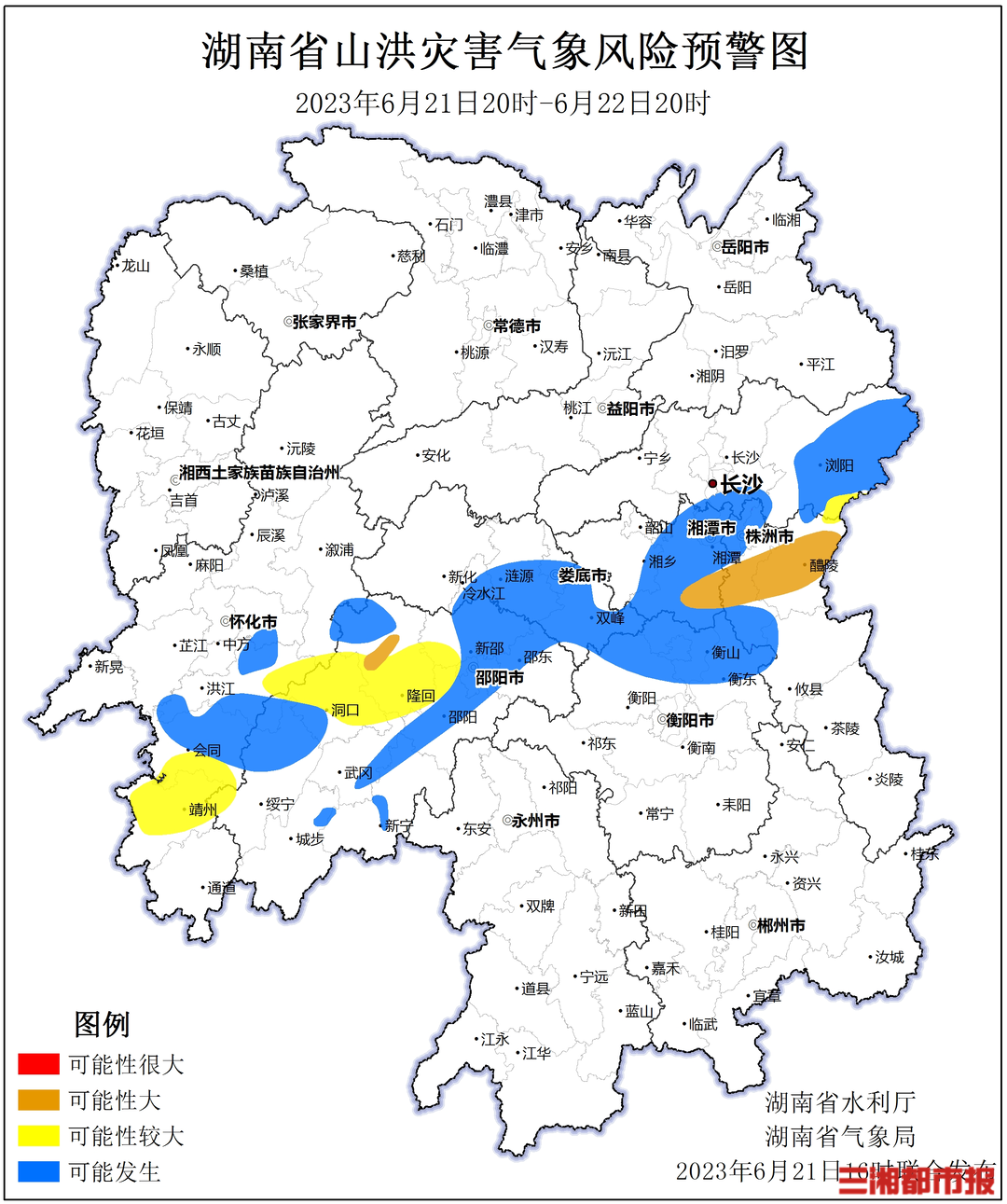 根据湖南省气象台2023年6月21日短期气象预报情况,湖南省水利厅与湖南省气象局联合会商得出如下结论:自6月21日 20:00至22日20:00,受降雨影响,邵阳市、怀化市、株洲市、长沙市、衡阳市、娄底市、湘潭市等局地可能发生山洪灾害(蓝色预警),其中,邵阳市、怀化市、株洲市、长沙市等局地发生山洪灾害的可能性较大(黄色预警);隆回县、渌口区、醴陵市、湘潭县等局地发生山洪灾害的可能性大(橙色预警)。