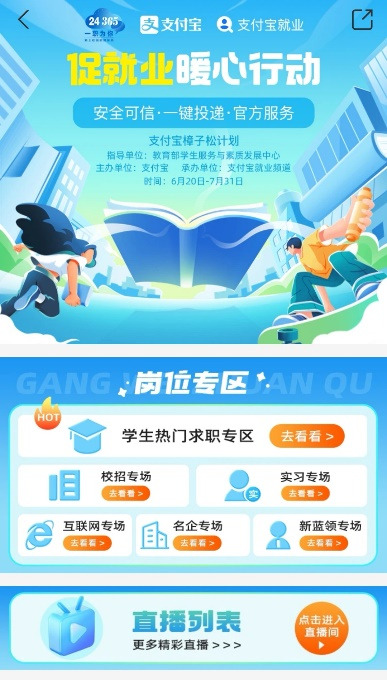 毕业季促就业暖心行动另一个亮眼的板块就是直播招聘。直播招聘为不同求职需求的毕业生群体提供形式多样的带岗服务,让企业与求职者实现高度互动,为青年求职者们拓展了多样的就业渠道。记者采访的几位高校毕业生表示,对在支付宝上找工作值得期待。