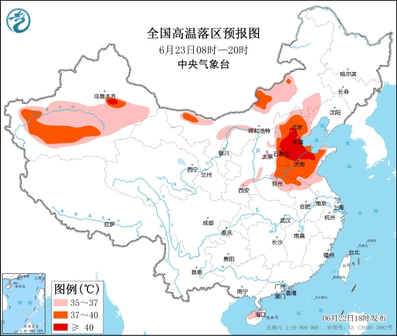 6月22日18时,中央气象台升级发布今年首个高温橙色预警。预计6月23日白天,华北、黄淮等地将继续出现35℃以上的高温天气,其中,北京、天津、河北、山东、河南北部和东部等地最高气温有37℃至39℃,北京、天津、河北中南部、山东中北部等地的部分地区可达40℃左右;此外,新疆吐鲁番和南疆盆地、内蒙古西部和中部偏北地区等地也有35℃至38℃的高温天气,吐鲁番局地最高气温可达40℃左右。