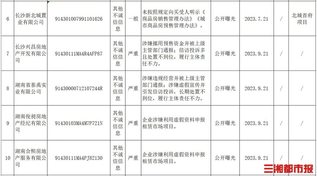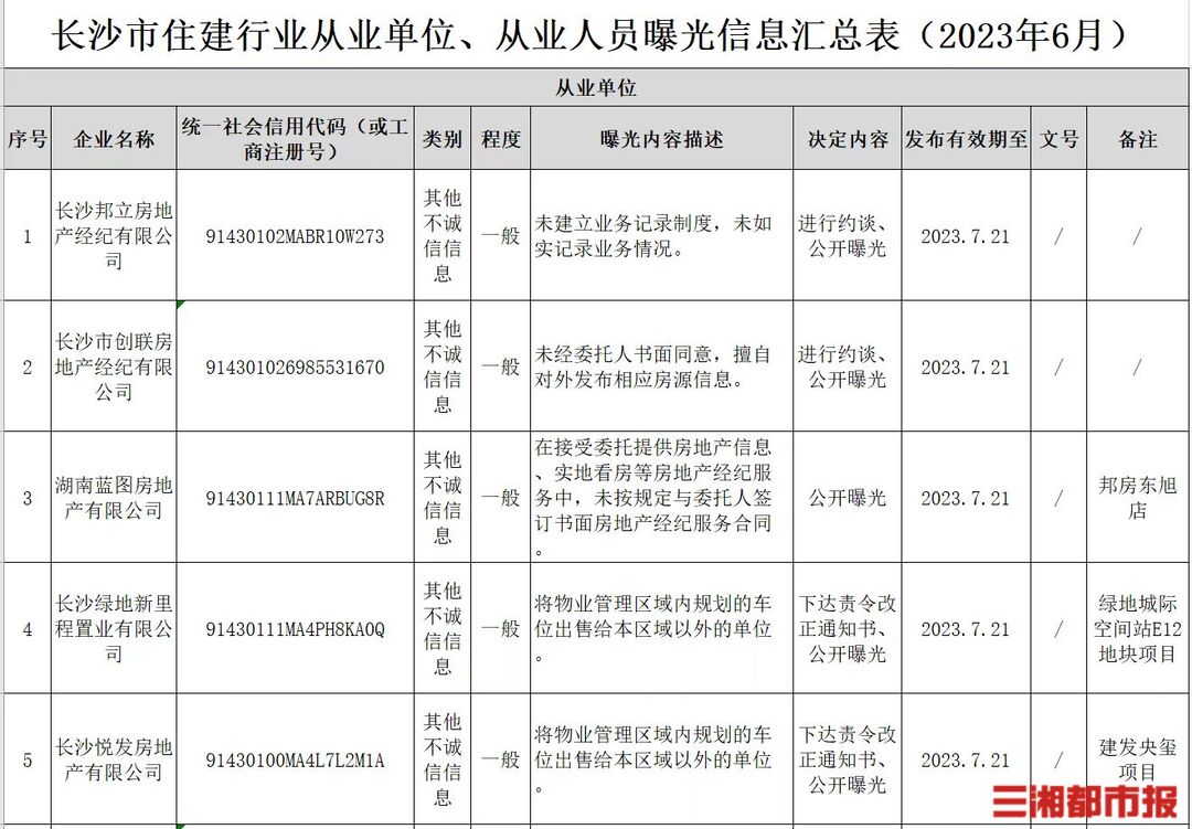 其中,长沙新北城置业有限公司因未按照规定向买受人明示《商品房销售管理办法》《城市商品房预售管理办法》被曝光;长沙邦立房地产经纪有限公司因未建立业务记录制度,未如实记录业务情况被曝光;湖南省泰禹实业有限公司因涉嫌违规经营并被上级主管部门通报,涉嫌虚假宣传并引发信访投诉,长期处置不到位,履行主体责任不力等原因被曝光;长沙绿地新里程置业有限公司因将物业管理区域内规划的车位出售给本区域以外的单位被曝光。