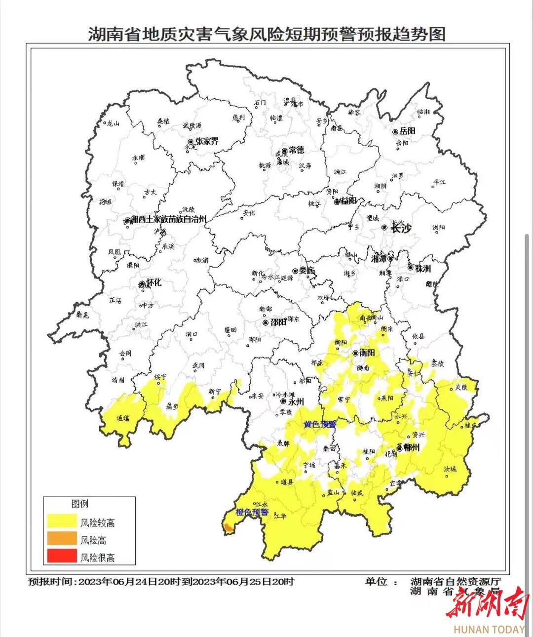 预警显示,自6月24日20时至25日20时,受降雨影响,湘南局地区域发生突发性地质灾害风险高(橙色预警),湘西南、湘南大部分区域发生突发性地质灾害风险较高(黄色预警)。