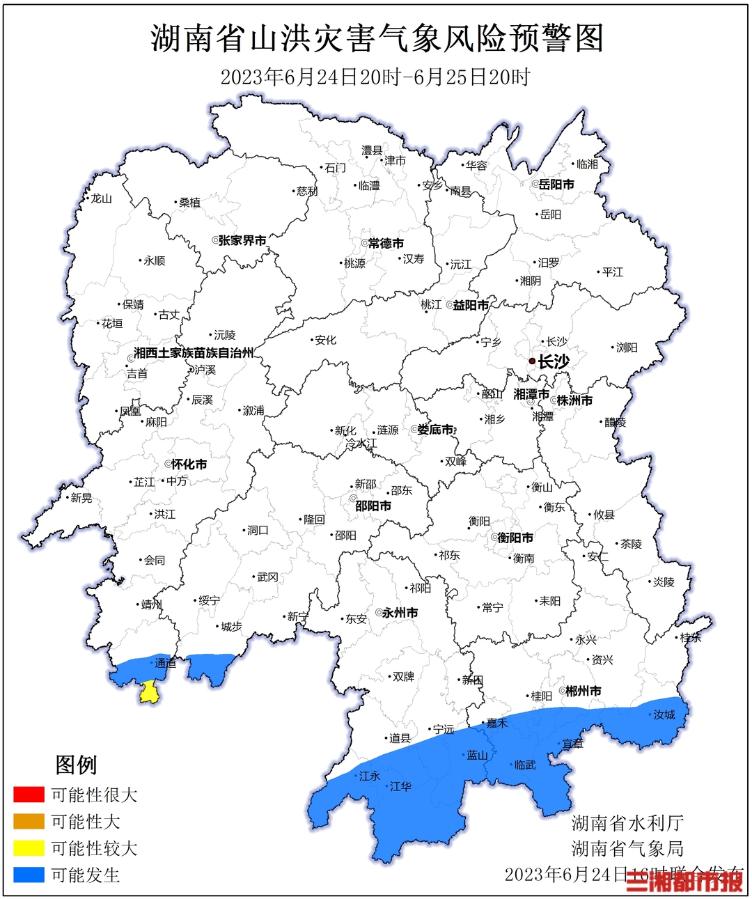 根据湖南省气象台2023年6月24日短期气象预报情况,湖南省水利厅与湖南省气象局联合会商得出如下结论:自6月24日20时至25日20时,受降雨影响,永州市、郴州市、邵阳市、怀化市等南部地区可能发生山洪灾害(蓝色预警),其中怀化市通道县南部局地发生山洪灾害的可能性较大(黄色预警)。