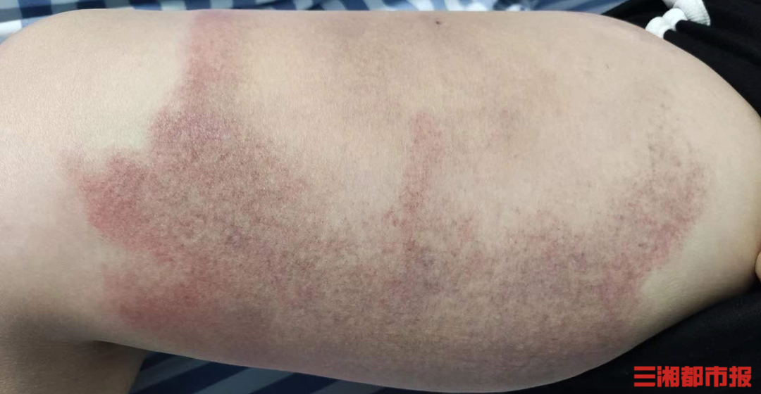 第二天起床后王女士发现,大腿被咬的地方,出现了小片状红斑,还有轻微疼痛、瘙痒,赶紧到诊所就诊。几天过去,伤口不但没好,反而更加严重,肿痛难忍,被转入湖南中医药大学第二附属医院皮肤科治疗。