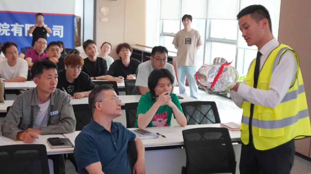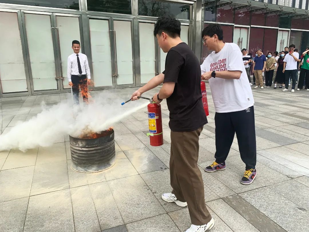 为达到学以致用,调动大家的学习积极性,理论知识培训结束后,消防教官组织大家对灭火器、过滤式消防自救呼吸器等应急救援器材进行了实操演练。一楼广场上,各部室迅速清点人数,向指挥员报告撤离情况,并跟随教官前往灭火演习现场。“一摇、二对、三拔、四压,遇到火情切莫慌张,灭火器使用方法其实很简单。”消防教官用简单易记的口诀向大家介绍灭火器的使用方法,随后员工们化身“消防员”,手持灭火器扑灭火情。