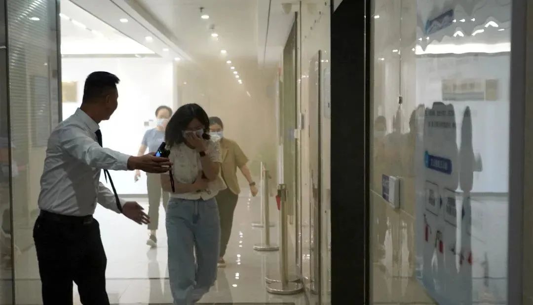 “发现火情,迅速组织疏散!”消防警报声响起,长沙电力设计院有限公司20楼、21楼走廊上“浓烟滚滚”。安全疏导员迅速就位,组织员工快速有序地从“火灾现场”疏散。员工们听从指令,弯着腰,捂住口鼻,沿着指定路线穿过滚滚浓烟,通过消防门进入楼梯间,快速撤离到集合点。整场演练人员分工明确,相互配合协作,动作规范准确,过程有条不紊、紧张有序,达到预期目的。