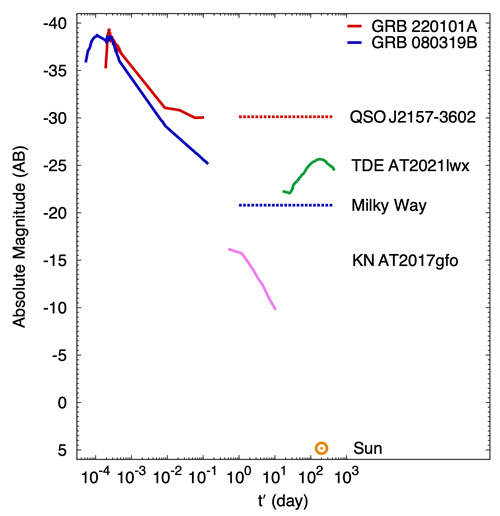 “但探测到的光学辐射其实是被红移过的紫外光子。这些紫外光子的被吸收效应非常严重,在到达地球之前已经损失了约99%,也就是实际的辐射流量是观测值的约100倍。这表明GRB 220101A是一个极其剧烈的光学紫外耀发。”论文的通讯作者、中国科学院紫金山天文台研究员范一中介绍,科研人员在随后的分析中发现,GRB 220101A的绝对星等达到了-39.4,这也是人类目前探测到的唯一一个绝对星等亮于-39等的光学紫外辐射源。