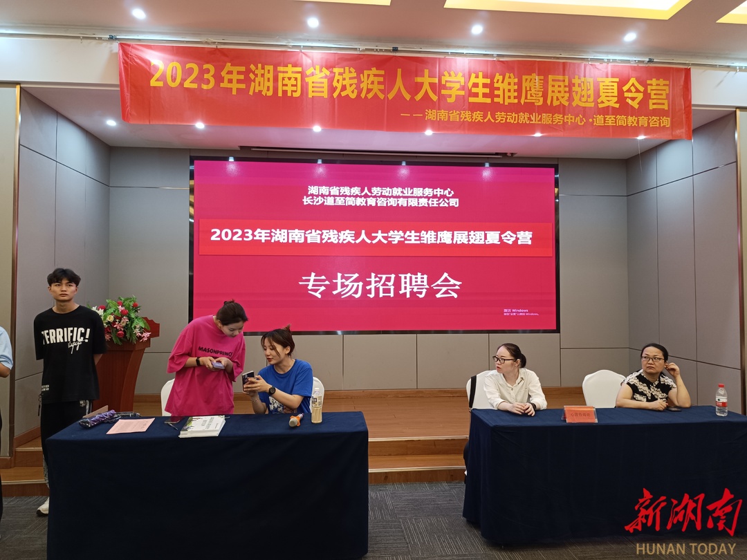 新湖南客户端6月30日讯(记者 刘琼琼)“以前投的简历都是石沉大海,没太多选择机会,这次的招聘会太给力了!目前有三家公司愿意录用我,此刻的心情真的特别激动,对未来满怀期待!”戴眼镜的年轻小伙子满面笑容地说道。今天, “用关注驱散迷茫 用专业达成梦想”2023年湖南省残疾人大学生雏鹰展翅夏令营专场招聘会活动在长沙举办,由湖南省残疾人劳动就业服务中心主办,长沙道至简教育咨询有限公司协办。