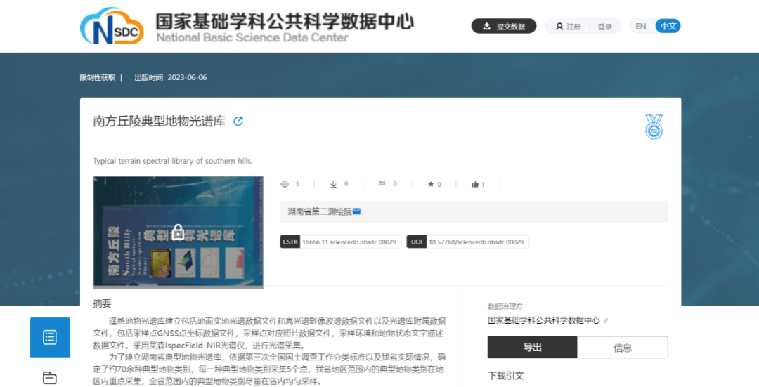 湖南省南方丘陵典型地物光谱库在国家基础学科公共科学数据中心公开发布