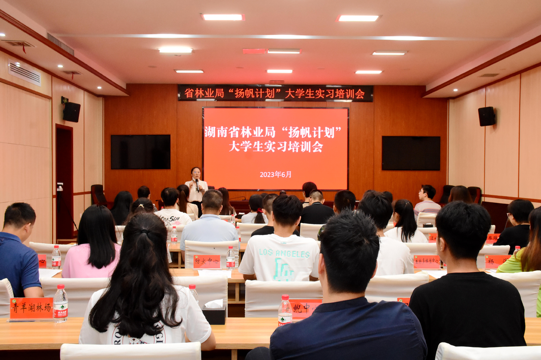 新湖南客户端6月30日讯(记者 陈龙)为贯彻落实共青团湖南省委发布《2023年湖南共青团促进大学生就业“金桥行动”实施方案》,为践行我省“三高四新”战略培养生力军,服务青年成长成才,持续抓好高校学生等重点群体就业和实习工作,省林业局联合中南林业科技大学(以下简称林科大)开展大学生实习“扬帆计划”。6月30日,省林业局在局机关办公室一楼举行“扬帆计划”大学生实习培训会,省林业局各处室站中心有关人员 ,林科大团委老师和实习大学生一共50余人参加。