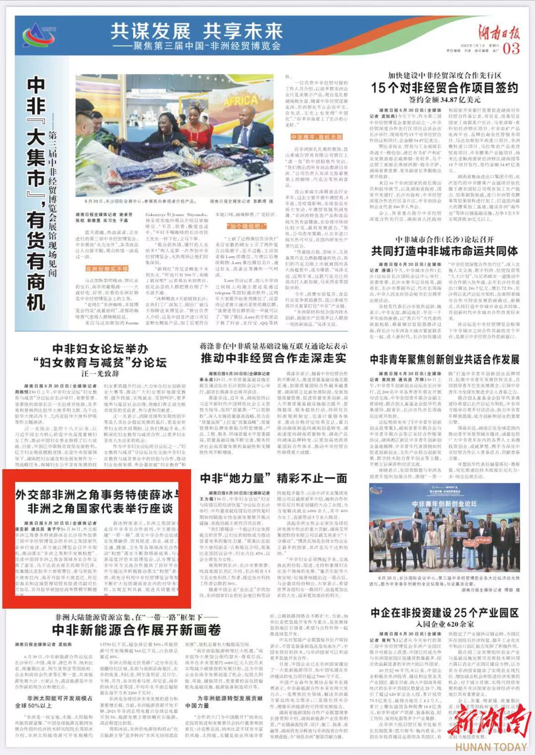 湖南日报6月30日讯(全媒体记者 唐亚新 通讯员 黄子宁)6月30日,外交部非洲之角事务特使薛冰在长沙同参加第三届中非经贸博览会的非洲之角国家代表举行座谈,双方就以博览会召开为契机,推动落实“非洲之角和平发展构想”、促进中国同非洲之角各领域务实合作交换了意见。乌干达农业部长托姆韦巴泽、埃塞俄比亚驻华大使塔费拉、索马里驻华大使库拉内、南苏丹驻华大使昆巴、肯尼亚海关和边境管理局贸易促进司副司长万加瓜、苏丹驻华使馆经商参赞穆罕默德出席。