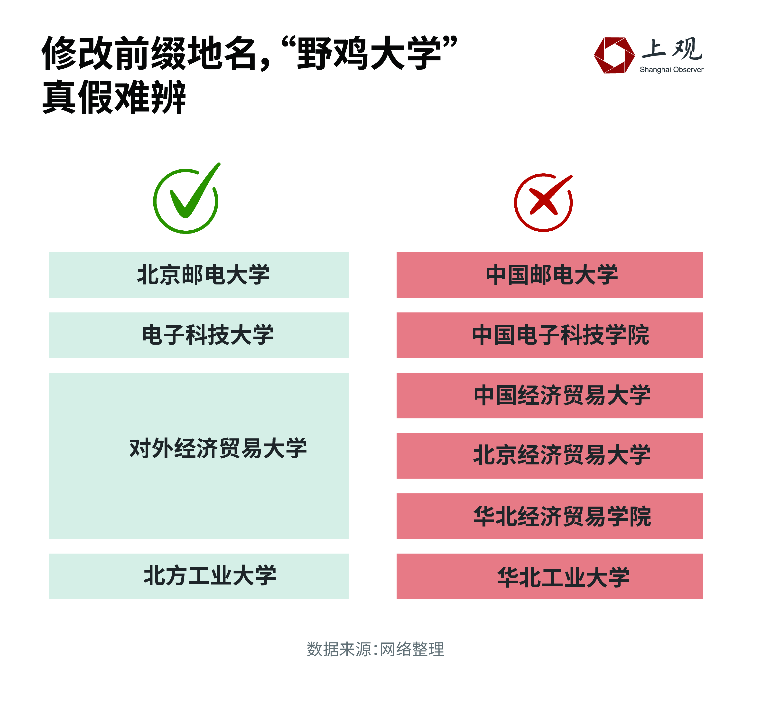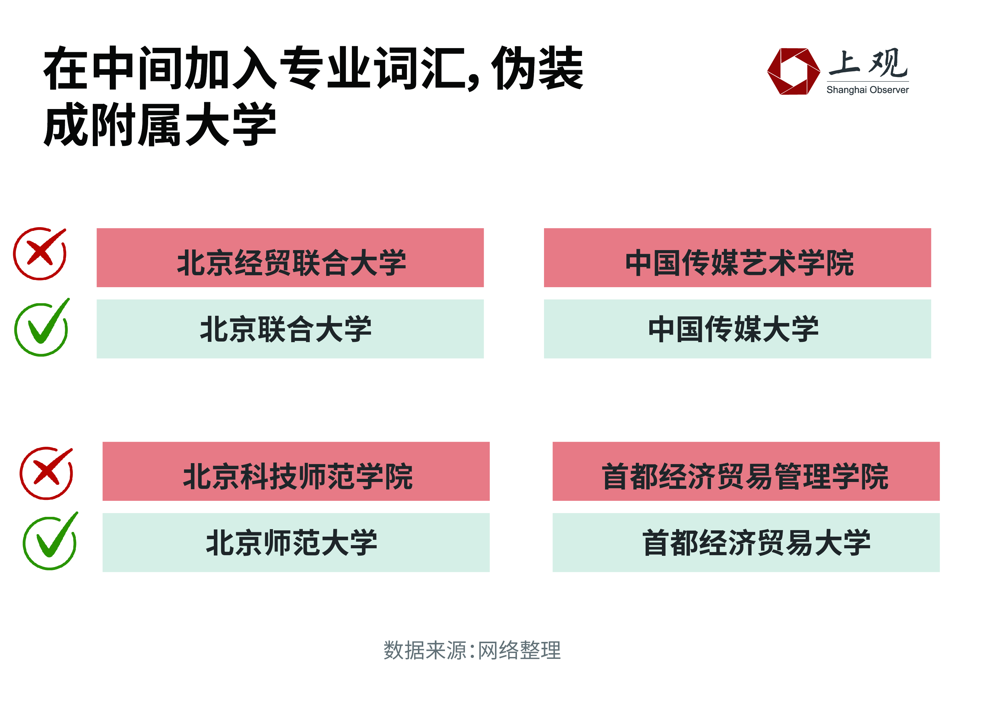 改前缀最简单,常常是换个地名即可。像是“北京联合大学”改为“北方联合大学”,“上海财经大学”摇身一变成为“北京财经大学”。网友若岚表示,因为听过上财,所以看到北财也不觉得奇怪,还觉得十分合理。