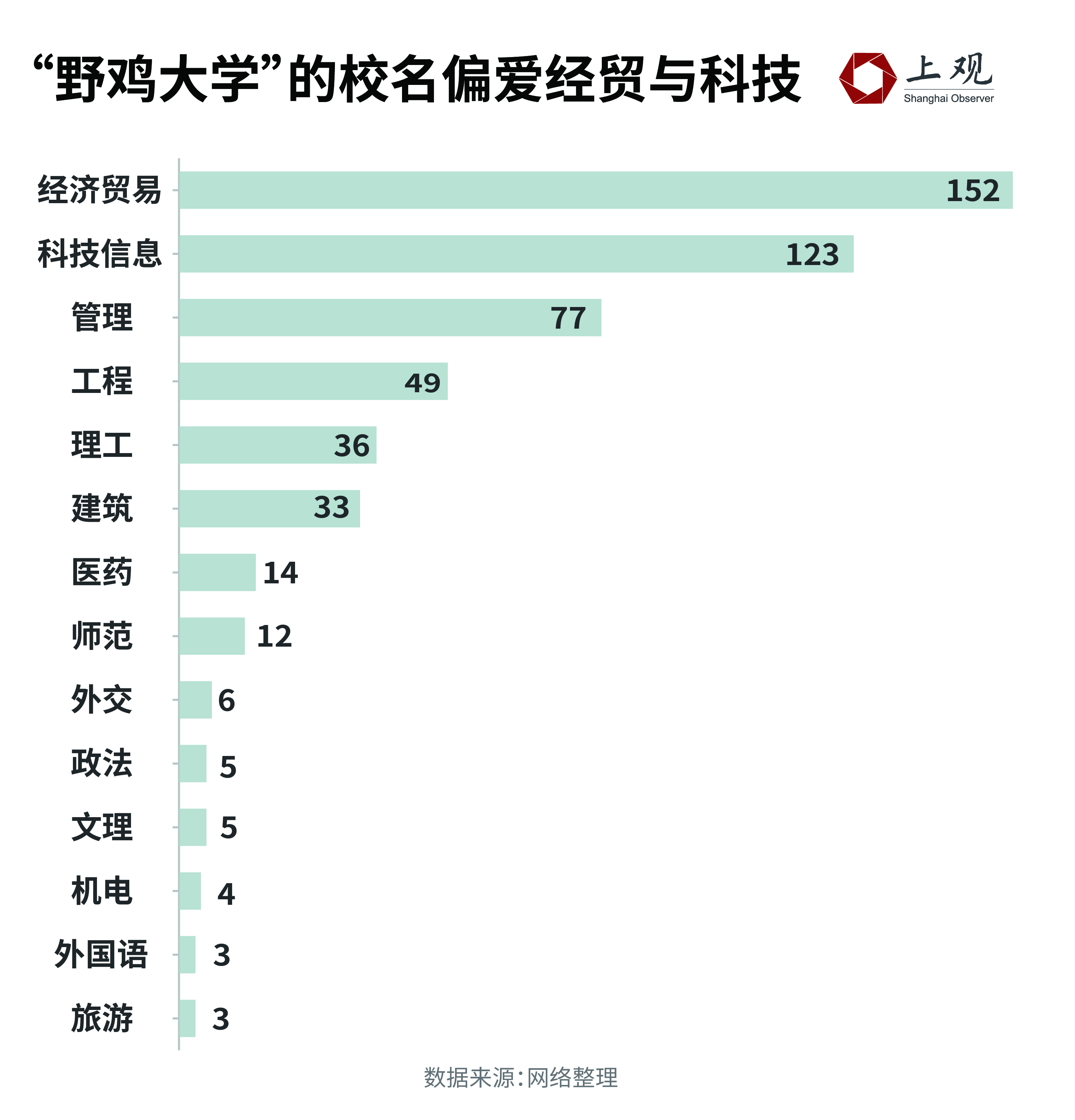 “经济贸易”与“科技”、“信息”是最常被冒用的,数量分别达到152、123所,像是“上海经济贸易大学”、“中国经贸学院”、“首都科技信息管理学院”等。