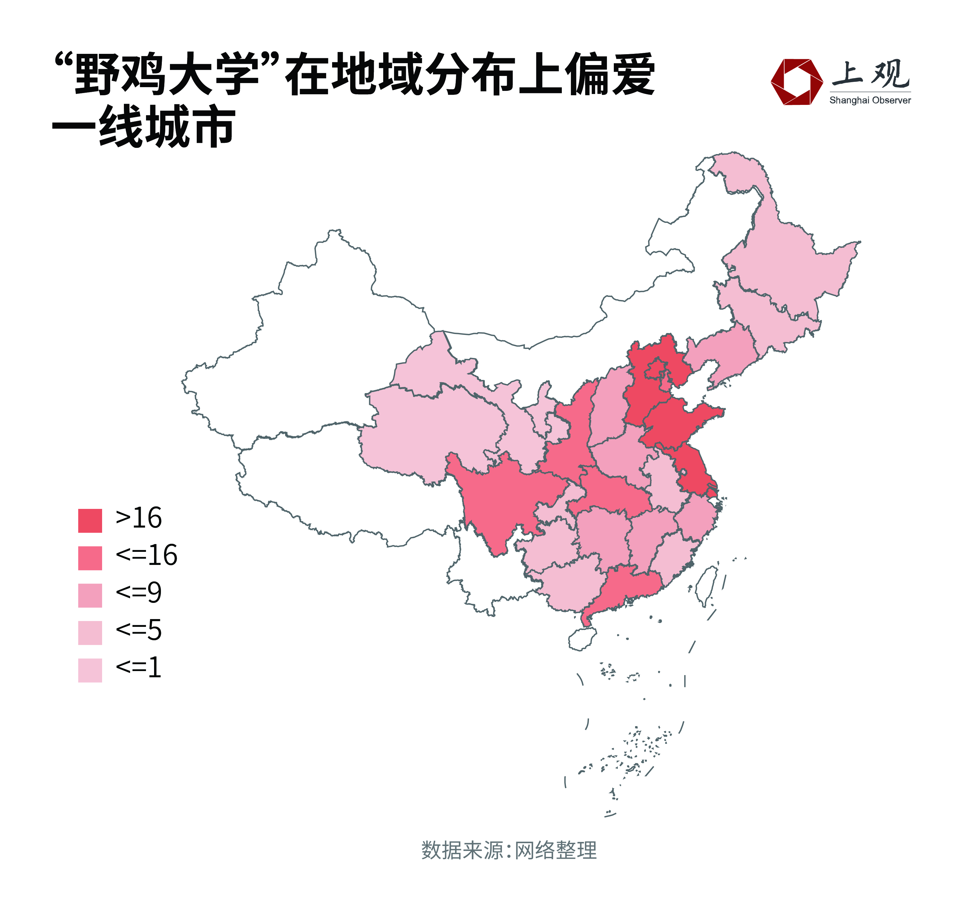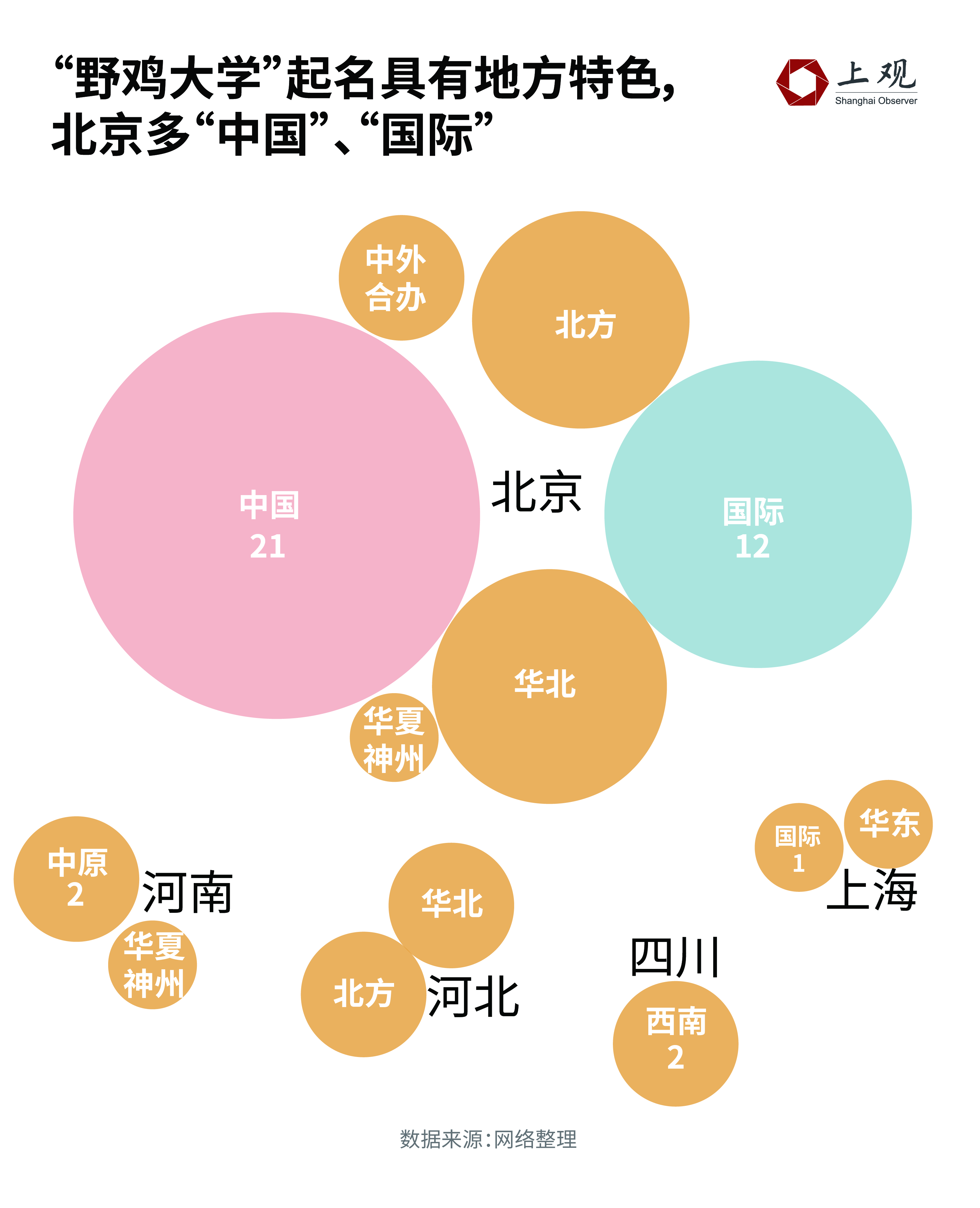 在分析的392所“野鸡大学”中,共有73所盗用了高于省市级别的地名。其中,超过30%的学校以“中国”打头。