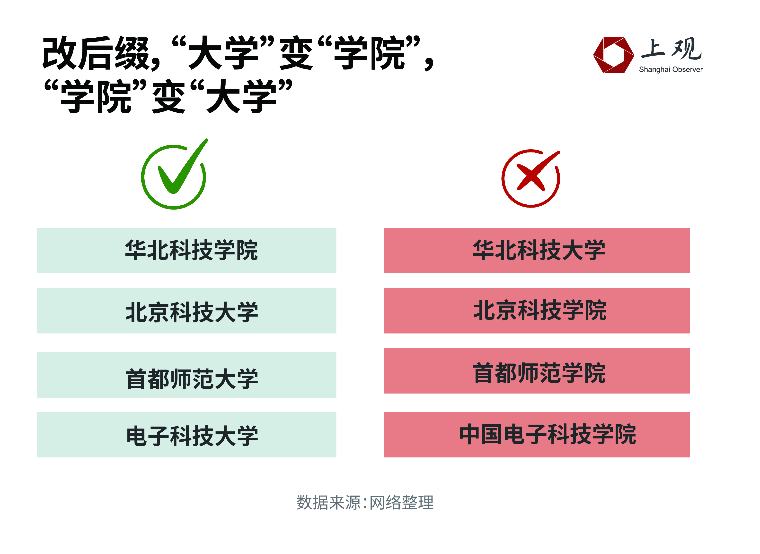 与前缀相似,换后缀则是对调“大学”与“学院”。例如将“首都师范大学”改为“首都师范学院”,将“华北科技学院”改为“华北科技大学”。
