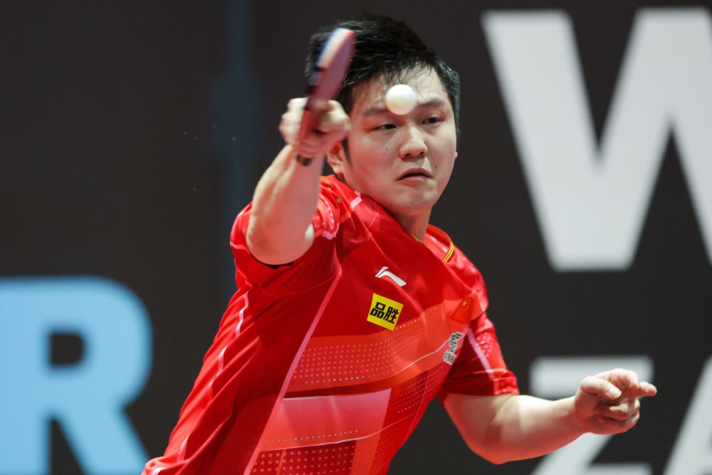 ↑中国选手樊振东在男子单打半决赛中回球。最终,他以3比1战胜队友林诗栋,晋级决赛。