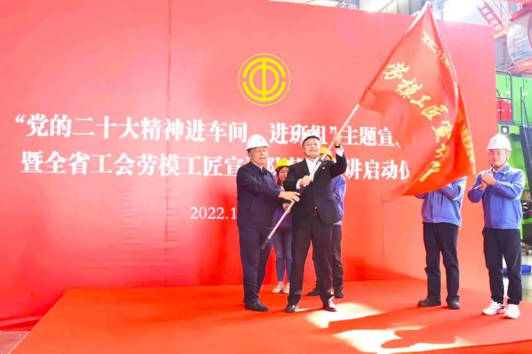 2022年11月1日,“党的二十大精神进车间、进班组”主题宣讲活动暨全省工会劳模工匠宣讲队基层宣讲在湘电集团正式启动。省人大常委会副主任、省总工会主席周农为劳模工匠宣讲队授旗。