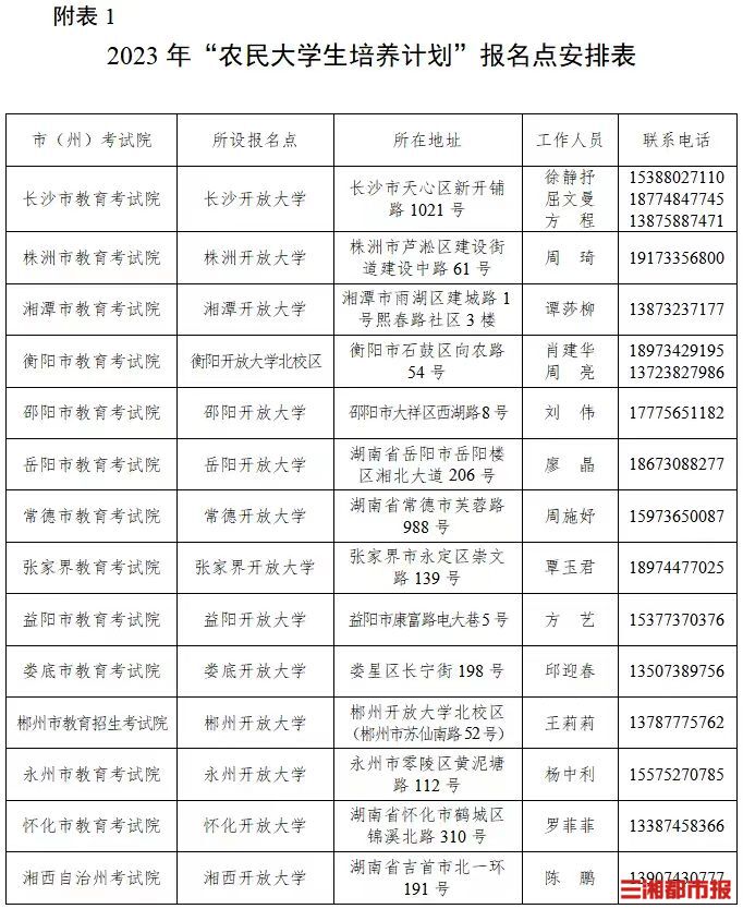 记者了解到,每个市(州)只设一个报名点,考生在户籍所在市(州)的指定报名点进行高考报名。符合2023年高考报名条件和“农民大学生培养计划”报考资格的考生须填写《2023年“农民大学生培养计划”报考资格审核表》,由村(社区)、乡镇(街道)初审并加盖公章,县(市、区)委组织部审核并加盖公章后凭身份证(原件和复印件)、户口本(原件和复印件)、毕业证(原件和复印件)等到各报名点参加报名。