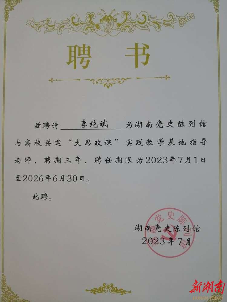 随后,举行共建基地指导老师聘请仪式,李纯斌被省党史陈列馆与高校共建“大思政课”实践教学基地聘为指导老师。