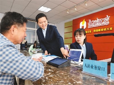 图为在湖北省襄阳市樊城区红光社区,居民在人社业务窗口咨询养老金相关政策。王 虎摄(人民视觉)