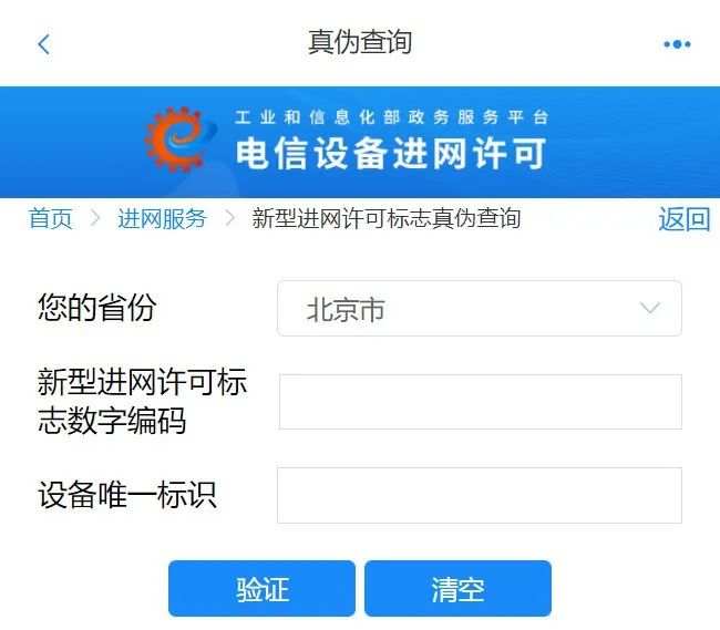 点击“真伪查询”链接,进入“新型进网许可标志验证”页面