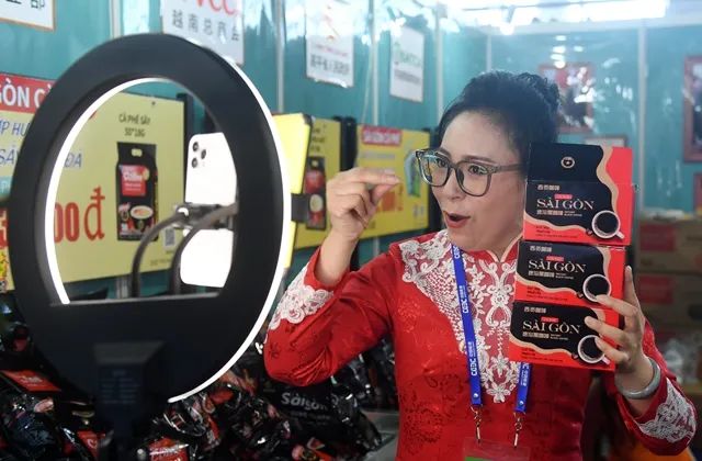 ▲去年9月的中国-东盟博览会展览现场,一名参展工作人员在通过网络推销越南咖啡。