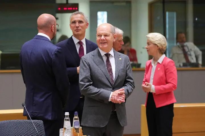 6月29日,在比利时布鲁塞尔,(从左至右)欧洲理事会主席米歇尔、北约秘书长斯托尔滕贝格、德国总理朔尔茨、欧盟外交与安全政策高级代表博雷利、欧盟委员会主席冯德莱恩在欧盟峰会前交谈。新华社记者郑焕松摄