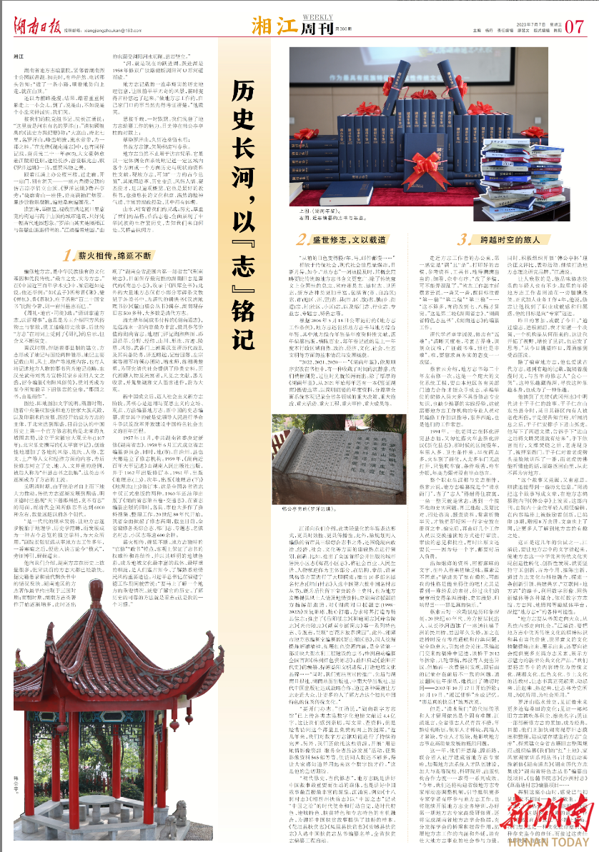 江涌向我们介绍,此类轻量化的年鉴表达形式,更具时效性、更具传播性。此外,除规划列入编修的省市县三级综合志书之外,还围绕湖南政治、经济、社会、文化等方面的建设热点进行策划、创新。比如,推出了全国首部公开出版的城市居民小区志《梅花小区志》,将社会百业、人民生活、人物家庭作为主体部分,在结构、章法、语言风格等方面进行了大胆探索;推出10多部名镇名村志(《阳山村志》入选中国第六批中国名村志丛书),既为后代留下宝贵的乡土史料,也为地方发展提供风土人情及地情资料;应湖南省援疆前方指挥部邀请,对《湖南对口援疆志(1998-2022)》反复雕琢、精心打磨,力求将其打造为精品佳志;推出了《岳阳楼志》《洞庭湖志》《舜帝陵志》《炎帝陵志》《湖南乡镇简志》等一系列特色志、专题志,呈现“百花齐放春满园”。此外,湘潭市地方志编纂室编纂的《韶山灌区志》,深入挖掘提炼韶灌精神,拓展红色资源内涵,是全省第一部反映大型水利工程建设的志书;株洲启动编纂全国首部《株洲红色资源志》;益阳启动《益阳古代史》的编纂,探源益阳文明进程,打造地域文化品牌……“同时,我们更注重宣传推广,先后与湖南日报社、湖南地图出版社、中南大学出版社、当代中国出版社达成战略合作。通过各种渠道让方志走近大众,让更多的人了解方志这个独具中国特色的优秀传统文化。”