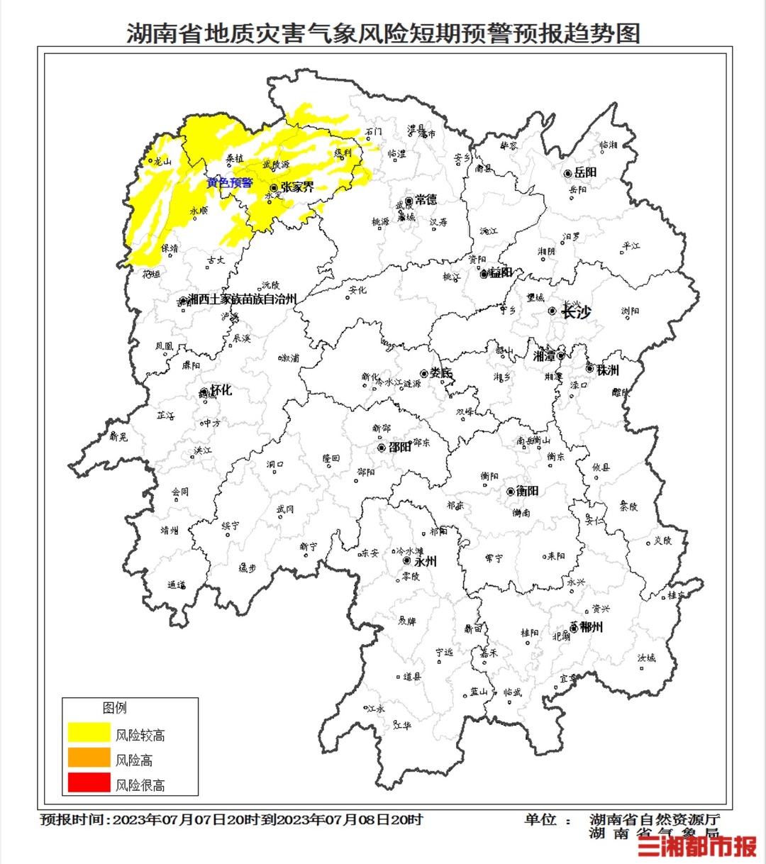 三湘都市报·新湖南客户端7月7日讯(文/视频 全媒体记者 李致远)根据地质灾害成灾规律和孕灾条件,结合2023年7月7日短期气象预报情况,省自然资源厅与省气象局联合会商得出如下结论:自7月7日20:00至8日20:00,受降雨影响,湘西北大部分区域发生突发性地质灾害风险较高(黄色预警)。
