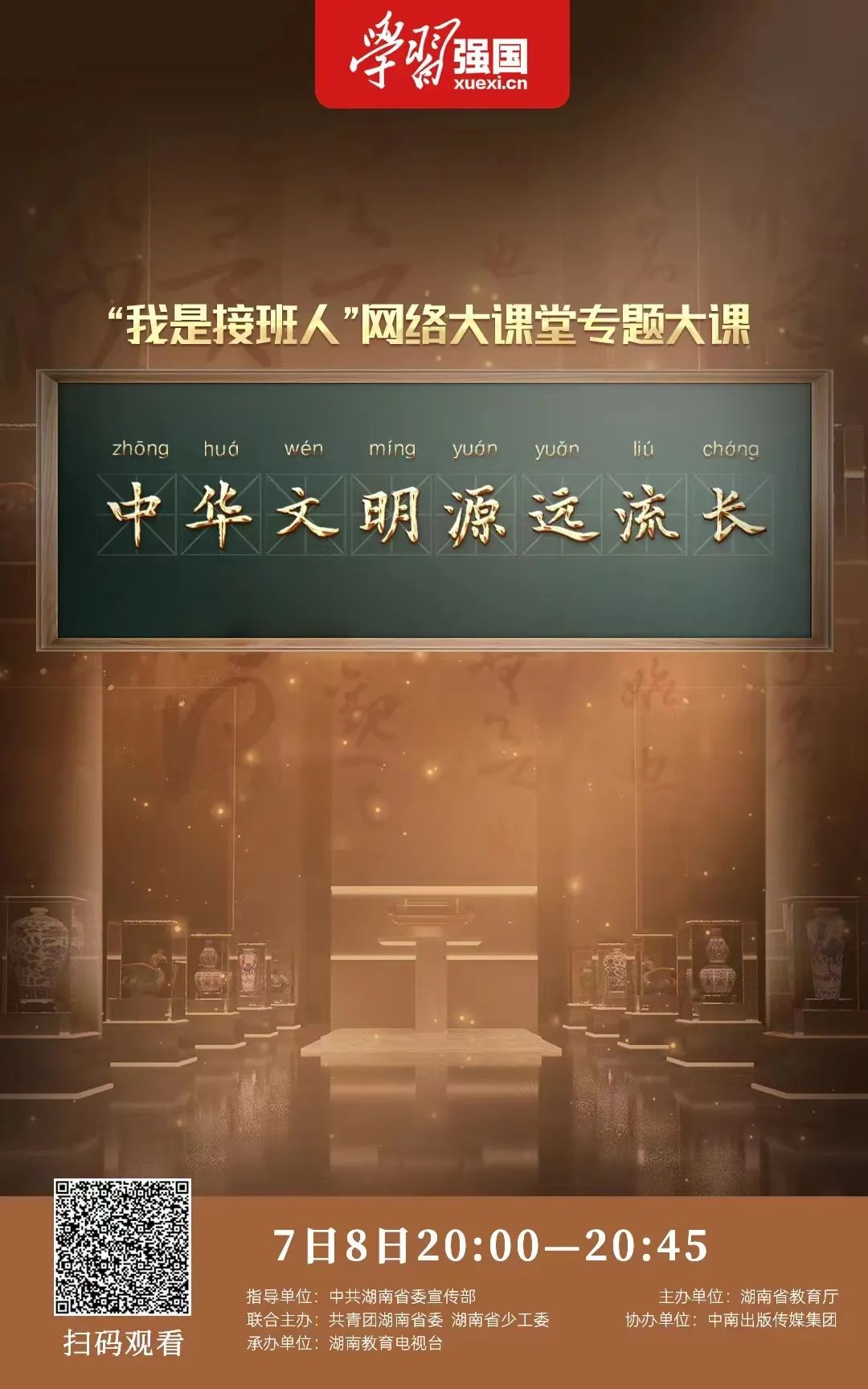 青少年处于世界观、人生观、价值观形成的关键期,我们要更好认识和认同中华文明,增强做中国人的志气、骨气、底气,让中华文明深深烙印在我们的灵魂里。 “我是接班人”网络大课堂文明溯源专题大课《中华文明源远流长》,将于7月8日20:00—20:45在“学习强国”学习平台“推荐”频道同步直播,与历史作伴,与文明对话,一同感受中华文明的魅力吧!