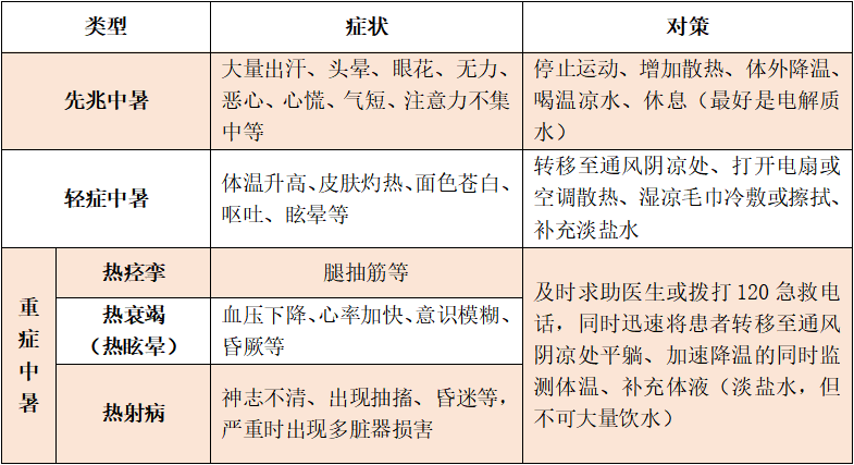 除了以上暑期体育运动的应知应会,在夏天运动时,一定要注意预防中暑,依发病轻重程度,可分为先兆中暑、轻症中暑和重症中暑。