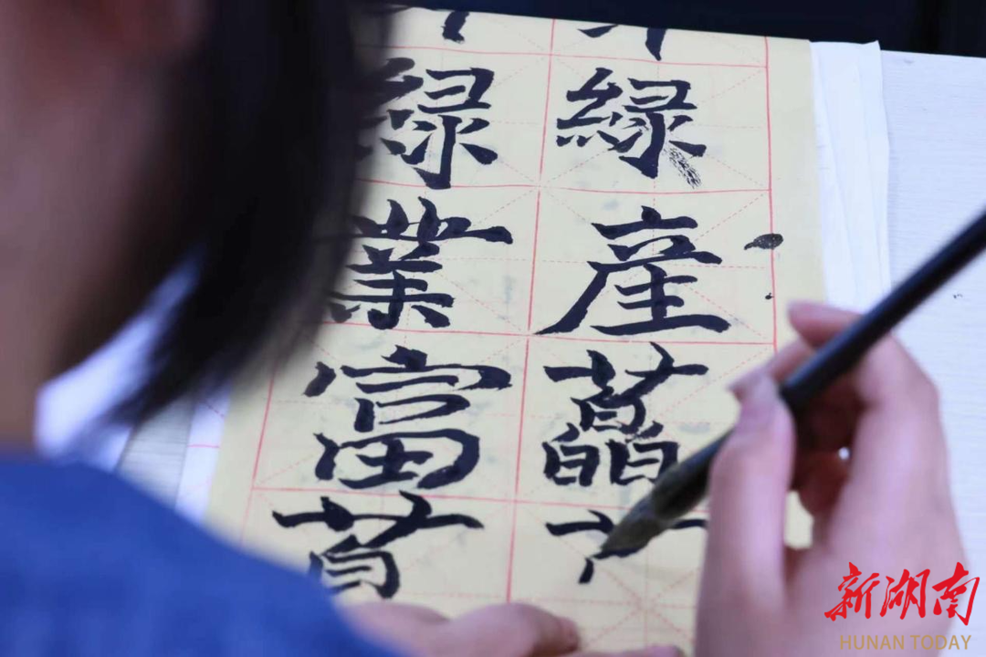书法课上,团队成员指导学生书写——“微风染藠绿,产业富民心”“春草今又绿,归来振家乡”“百草丰茂,洪波涌起”等语句,在书法推普的同时宣传当地特色产品与景点,并鼓励大家为家乡特产藠果创作“藠”字创意书体。