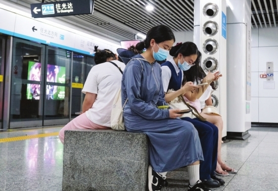7月9日下午,长沙地铁2号线迎宾路口站,几名乘客靠近空调出风口吹凉风。图/通讯员林道辉