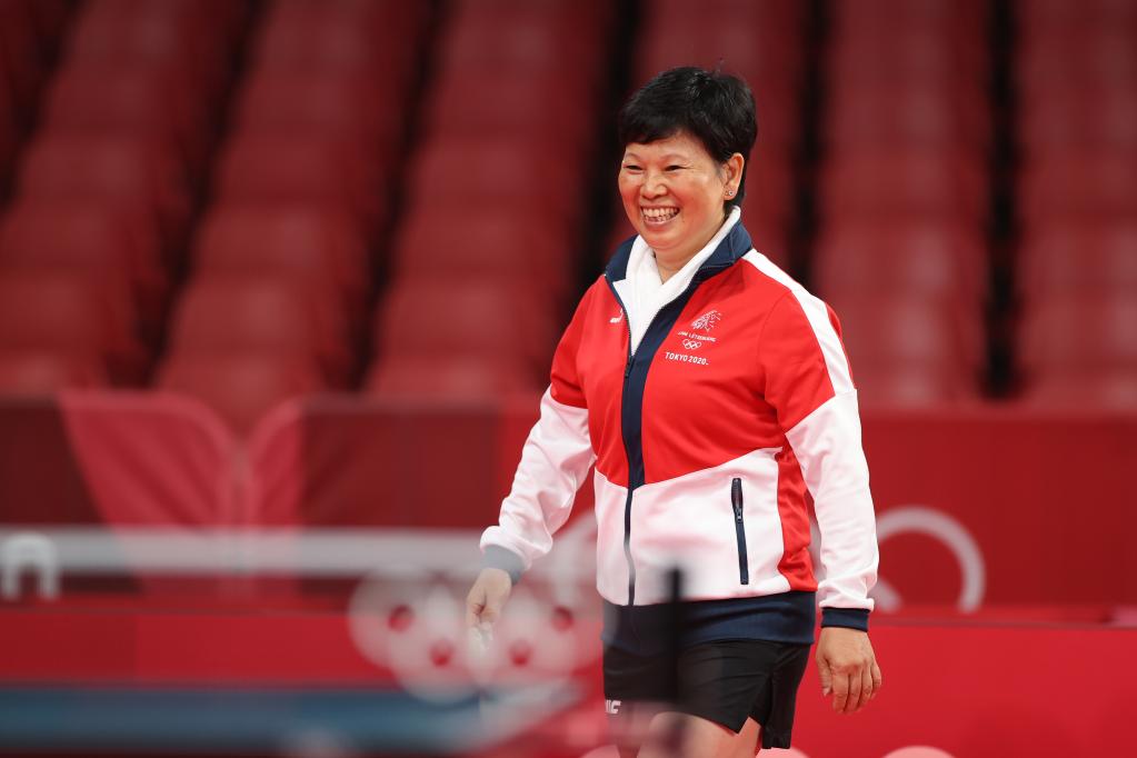 2021年7月25日,在日本东京体育馆举行的东京奥运会乒乓球项目女子单打第二轮比赛中,卢森堡老将倪夏莲准备出场比赛。新华社记者 郑焕松 摄