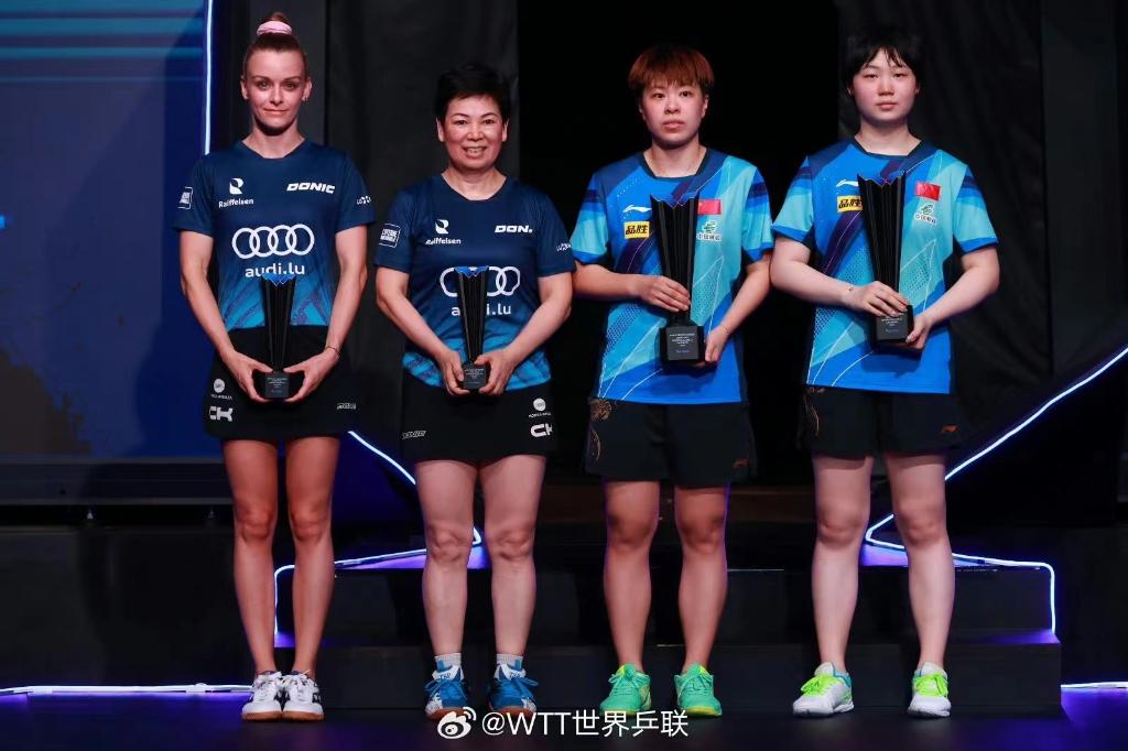 7月9日,世界乒乓球职业大联盟(WTT)卢布尔雅那球星挑战赛女双颁奖典礼,德努特(左一)/倪夏莲(左二)不敌中国组合王艺迪(右二)/蒯曼(右一)。图片来自WTT社交平台官方账号