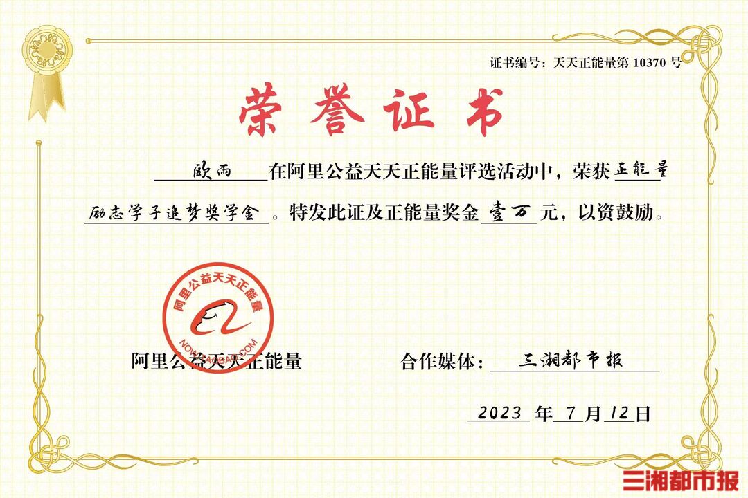 7月12日,三湘都市报联合阿里公益天天正能量为欧雨颁发10000元“正能量励志学子追梦奖学金”,助她逆风飞翔。