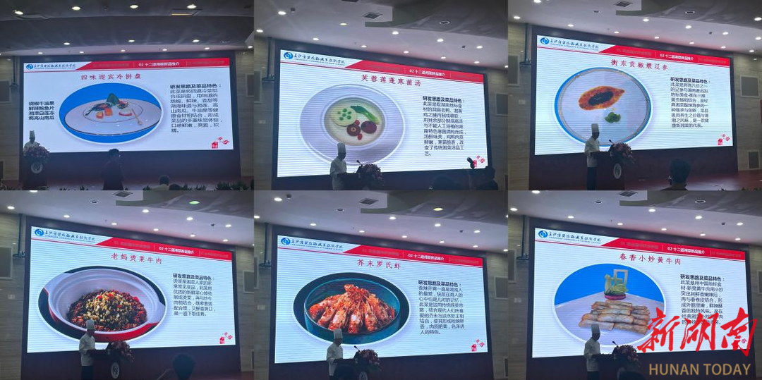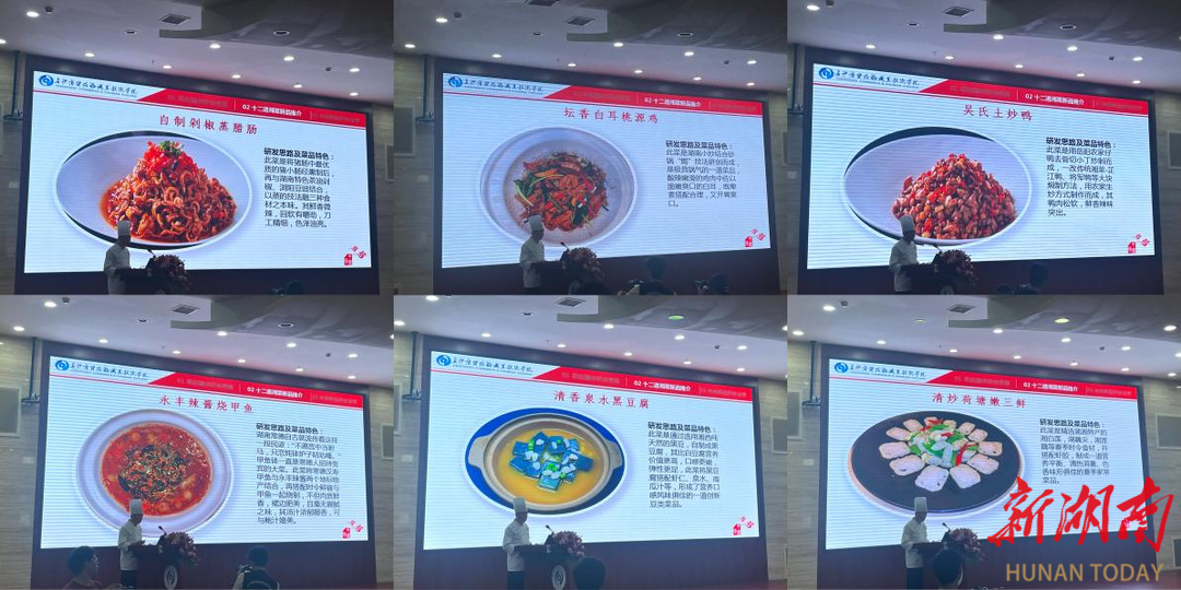 湖南日报·新湖南客户端7月12日讯(记者 张福芳 实习生 王馨玥)今天上午,在第七届全国餐饮职业教育高峰论坛暨全国数字餐饮行业产教融合共同成立大会后,长沙商贸旅游职业技术学院举行“十二道湘味”新菜品发布会,总监制段辉煌为与会嘉宾逐一介绍十二道新菜品的研发思路及菜品特色。