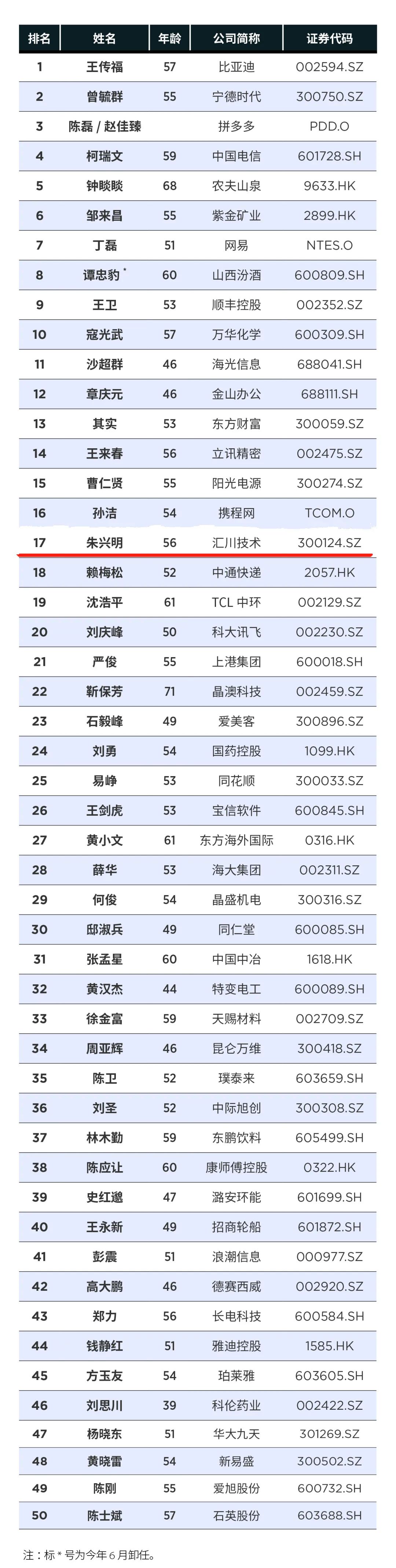 这是朱兴明连续第三年入围福布斯中国最佳CEO榜单。在整个榜单中,只有10人是连续两年入围,而连续三年入围的更是仅有3人,除了朱兴明,另外两人是比亚迪的王传福和宁德时代的曾毓群。