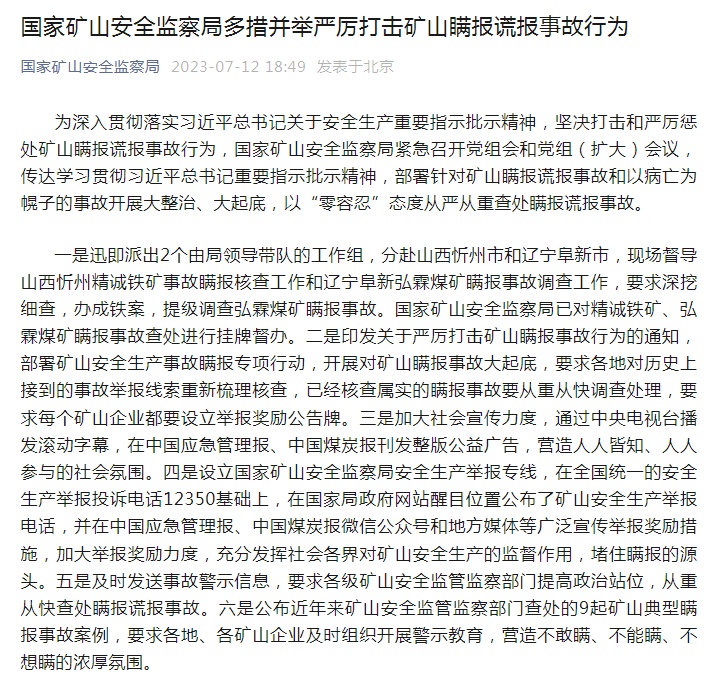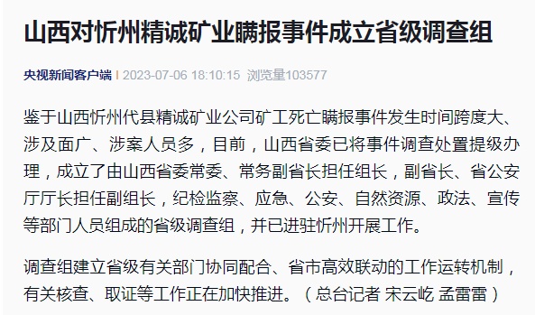 日前,山西对忻州精诚矿业瞒报事件成立省级调查组