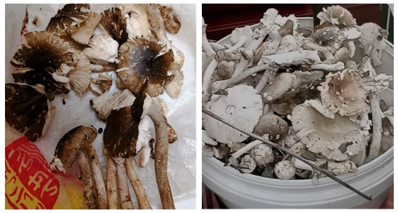 中毒患者均进食蘑菇后后第二天出现恶心、呕吐、腹泻等症状,在当地卫生院考虑为致命性毒蘑菇中毒转入湘雅常德医院急诊科,经检查发现患者都有不同程度肝功能损害,其中2名患者出现急性肝衰竭,病情危重。经询问采蘑菇的中毒者,均描述采食了多种蘑菇,包括“芝麻菌”“茶花菌”“石灰菌”等。结合患者潜伏期长(>6小时)、肝功能损害、“芝麻菌”和灰花纹鹅膏菌外形相似,考虑为灰花纹鹅膏菌中毒。