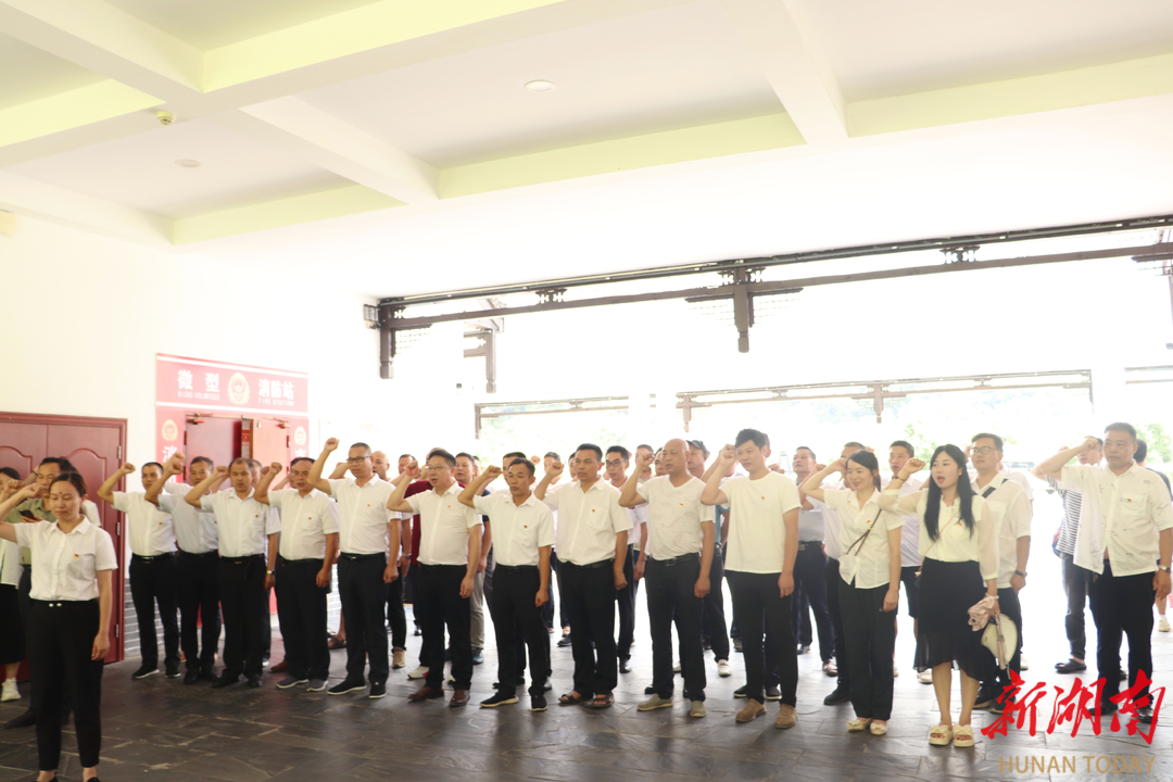 在沙洲瑶族村党史纪念馆,张丽君、朱莉两名新党员进行了入党宣誓,全体党员重温入党誓词。讲解员向大家介绍沙洲村在党的带领下,同心同德,决战决胜,从一个偏僻荒远的小山村,晋升为全国知名的红色旅游景区、生态优美、百姓幸福指数不断增强的发展历程。