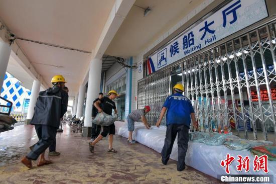 工人将防洪沙袋摆放在海口秀英港的售票大厅入口。骆云飞 摄
