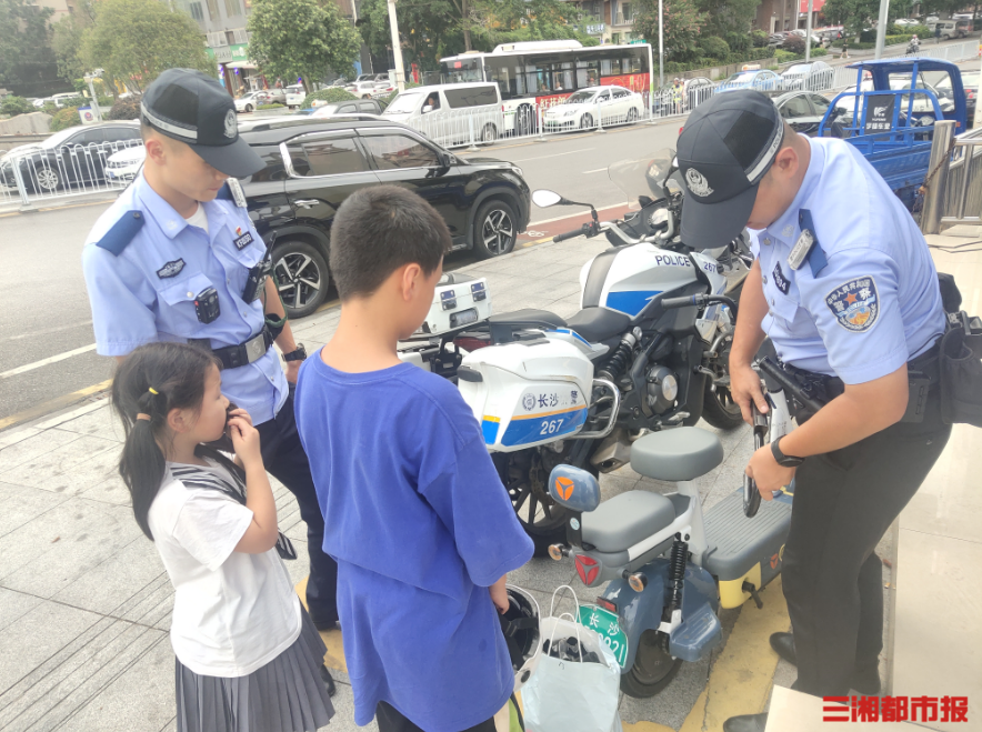 7月15日17时许,两个孩子走进雨花交警铁骑中队岗亭,怯生生地喊“交警叔叔”。民警询问后才知道,兄妹俩哥哥13岁,妹妹才6岁,父母在长沙市中心医院体检,因为医院人太多,排队需要时间。哥哥想先回家,从爸爸手里拿到电单车的钥匙后,自己载着妹妹回家。哪知道途中迷了路,电单车又快没电了,看到旁边有交警岗亭就把车停在路边,过来求助。