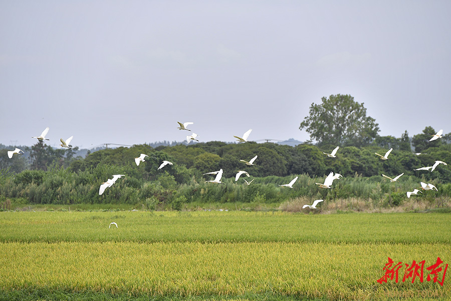 7月17日,常德市鼎城区草坪镇,大群白鹭在稻田间飞舞,构成了一幅美丽和谐的生态画卷。 湖南日报全媒体记者 童迪 摄