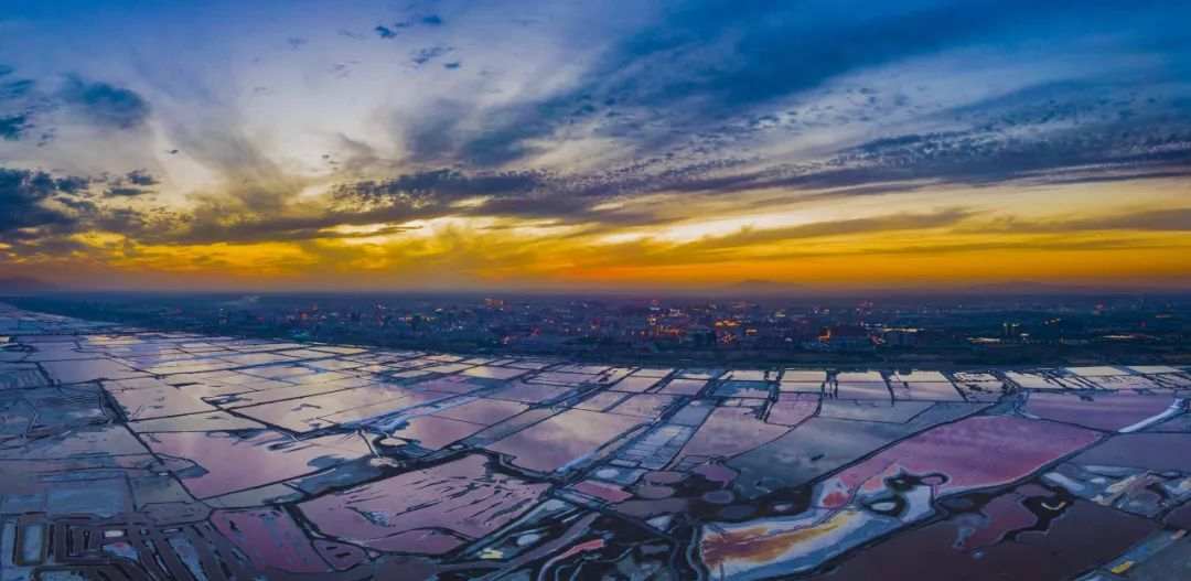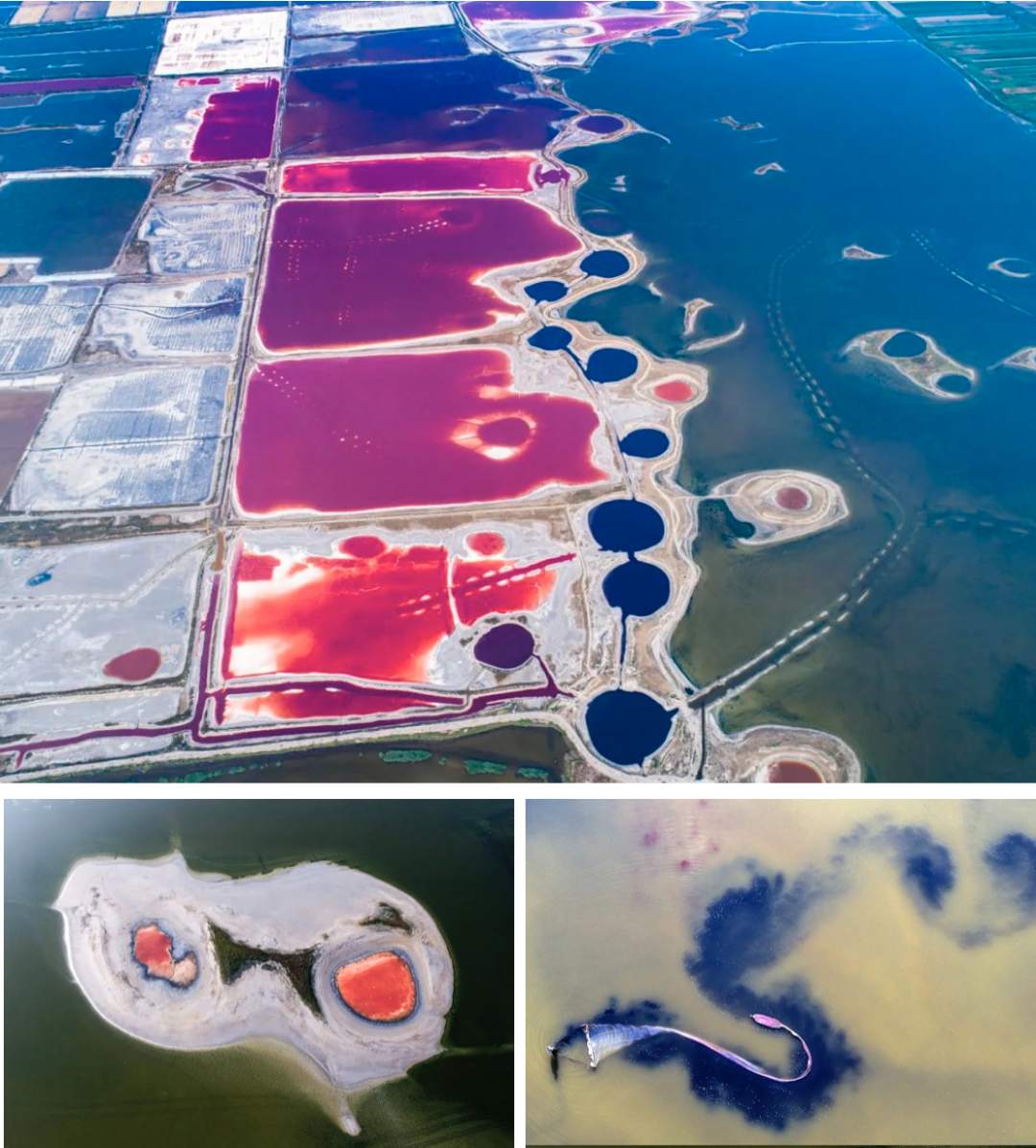 盛夏时节,湖水不断蒸发浓缩,由于盐畦阡陌纵横,各个池中盐度、矿物质含量不同,迅速繁殖的杜氏盐藻产生叶绿素、类胡萝卜素的特性,和以藻类为食的卤虫一起,把各个盐池染成了深浅不一的调色盘,造就了七彩斑斓的盐湖景观。