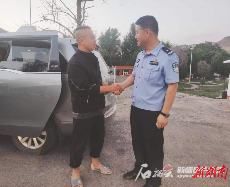 当天下午,吕小武(左)与庙尔沟派出所所长安志文交流。庙尔沟派出所供图
