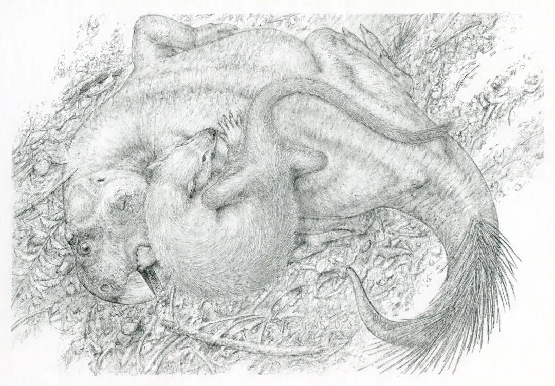 “强壮爬兽当时正俯坐在鹦鹉嘴龙背侧,并用力抓着鹦鹉嘴龙的下巴、撕咬着它的肋部,而爬兽的小腿又被鹦鹉嘴龙的后腿紧紧夹着,这足以说明爬兽正在攻击鹦鹉嘴龙。” 参与此项研究的加拿大自然博物馆古生物学者吴肖春博士向记者这样描述。这块罕见的化石保存完好,收藏在中国山东省威海紫光实验学校博物馆,由海南科技职业大学韩刚教授在陆家屯采集,而此地被称为“中国的恐龙庞贝城”。化石中的鹦鹉嘴龙大小与一只大型犬相当,与之殊死搏斗的哺乳动物是一种类似獾的动物,称为强壮爬兽,生活在1.25亿年前的白垩纪,是当时最大的哺乳动物之一,但体重大约仅为鹦鹉嘴龙的1/3。在此之前,已有化石显示强壮爬兽的胃中发现了鹦鹉嘴龙幼年个体的骨骼,这表明爬兽是食肉动物,但无法证明它吃掉的鹦鹉嘴龙是活着的还是已经死去。加拿大自然博物馆的古生物学家乔丹·马隆博士与吴肖春、韩刚研究后认为,这块化石中爬兽是在捕食鹦鹉嘴龙而不是啃食尸体,因为恐龙骨架上没有留下被啃食的牙印。同时,爬兽位于鹦鹉嘴龙背部的位置也表明它是攻击者。吴肖春说,虽然爬兽体型不大,但攻击比它大很多的恐龙并非难事,在现今世界中,黄鼠狼、野狗、鬣狗等经常会猎杀较大的猎物。遗憾的是,战胜了恐龙的爬兽却败在物种演化的长河中,最终也和恐龙一样走向灭绝。加拿大自然博物馆矿物学家亚伦·卢西耶博士在化石围岩的基质中发现大量火山物质。马隆解释道:“这也可能是这块化石中的情况,爬兽在鹦鹉嘴龙还活着的时候就想吃了它 ,不过,它们都葬身于突然爆发的火山喷发及随后的火山泥石流中。”责编:周阳乐