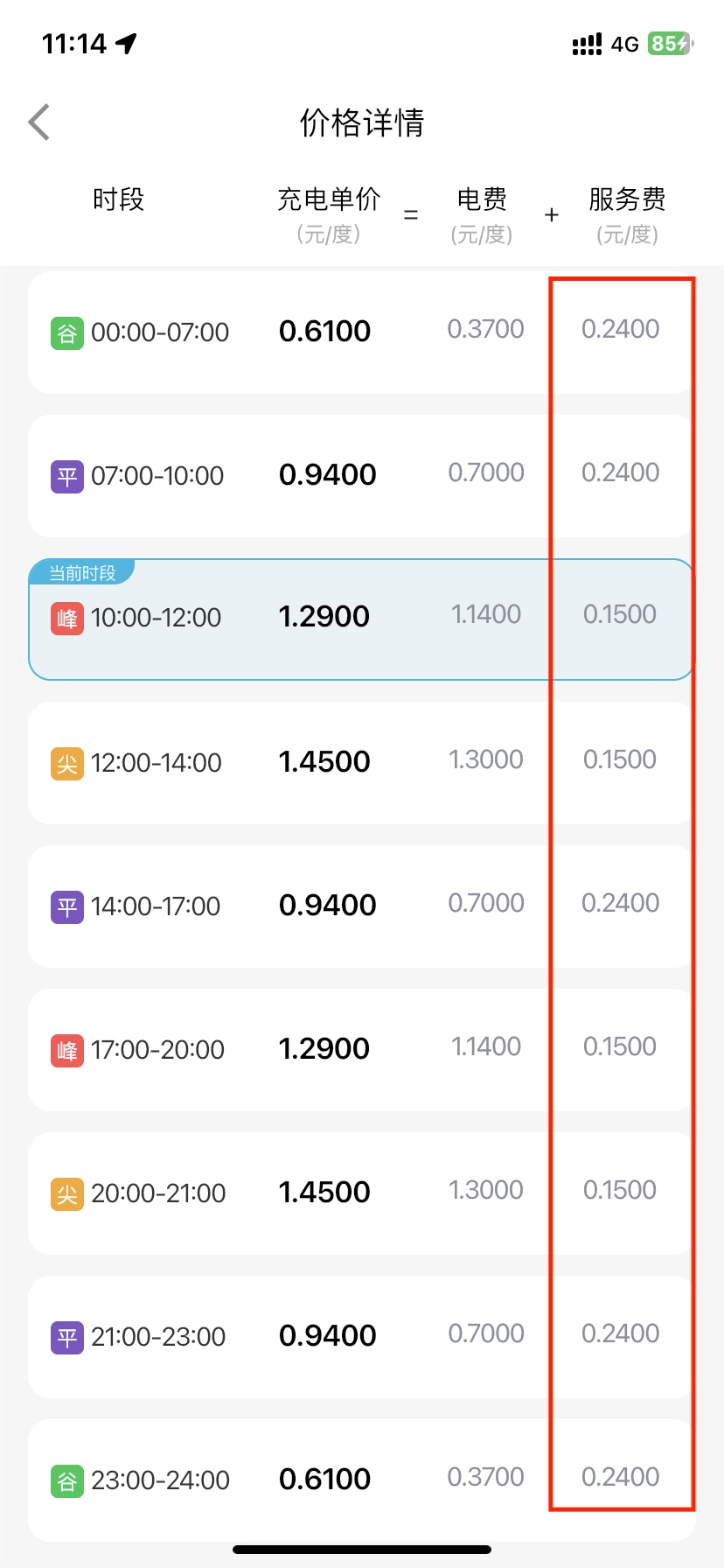 此外,特来电远离闹市区的郑州古荥镇纪公庙充电站,服务费最高也只有0.24元/度、最低0.15元/度,远远低于闹市区内0.6元/度的服务费。