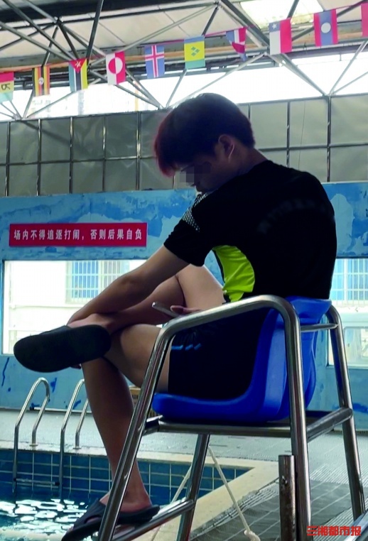(长沙雨花区森雾游泳馆内,一名在岗的救生员正低头看手机。)