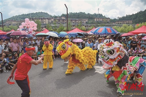 7月23日,凤凰县禾库镇红安社区,苗族群众舞狮欢庆“六月六”。